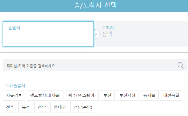 출/도착지 선택에서 출발지를 입력하게 되면 출발징서 도착하는 터미널의 목록이 뜨게 됩니다. 어렵지 않게 이용하실 수 있으니 필요한 경우라면 꼭 확인해 보세요.